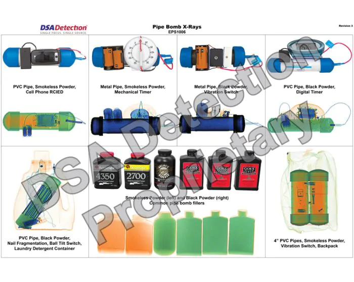 This 36" x 24" poster displays many different types of pipe bombs that could potentially be encountered at a checkpoint. The poster also includes an X-ray image of each pipe bomb to allow security staff to familiarize themselves with this type of threat.
