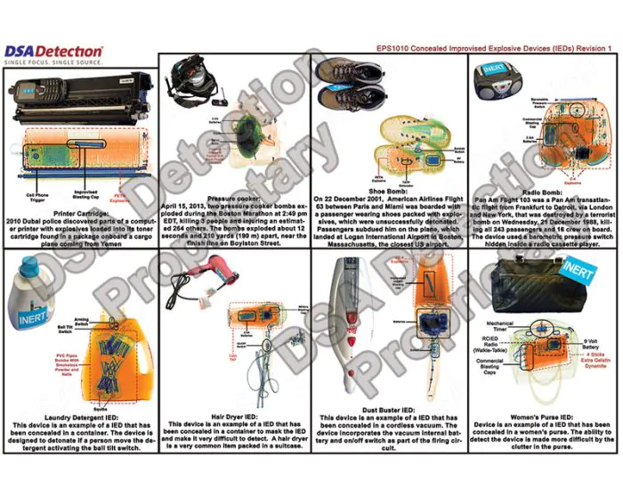 This 36" x 24" poster displays many different types of IEDs concealed in common, everyday items that could potentially be encountered at a checkpoint. The poster also includes an X-ray image of each concealed IED. The poster will help your staff familiarize themselves with what these threats look like in an X-ray.