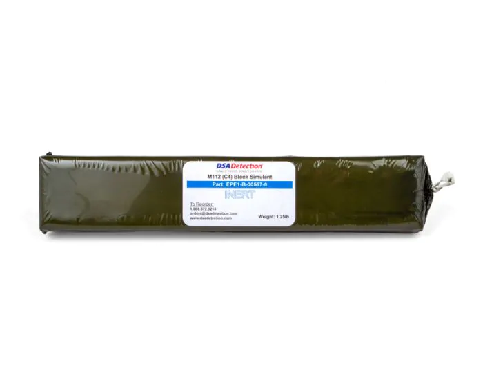 This training aid simulates an M112, 1.25 lb C4 charge. The explosive simulant is visually correct and engineered to have the same density and effective atomic number (Zeff) as the real explosive threat.
