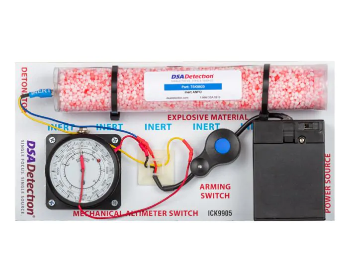 Powered by two C batteries, this IED circuit would be activated by rotating the bezel on the altimeter to the desired elevation. Once the elevation is reached, the altimeter needle will complete the circuit. The X-ray correct ANFO (ammonium nitrate-fuel oil) simulant is engineered to have the same density and effective atomic number (Zeff) as the real explosive threat.