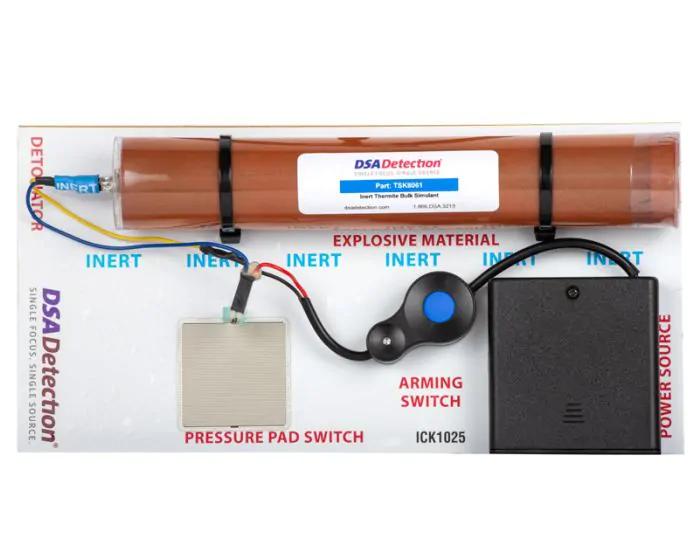 Powered by four AA batteries, this IED circuit would be activated by applying pressure to the pressure pad switch. The X-ray correct thermite pyrotechnic simulant is engineered to have the same density and effective atomic number (Zeff) as the real explosive threat. Unlike most explosives, thermite displays blue in most material discrimination X-ray systems.