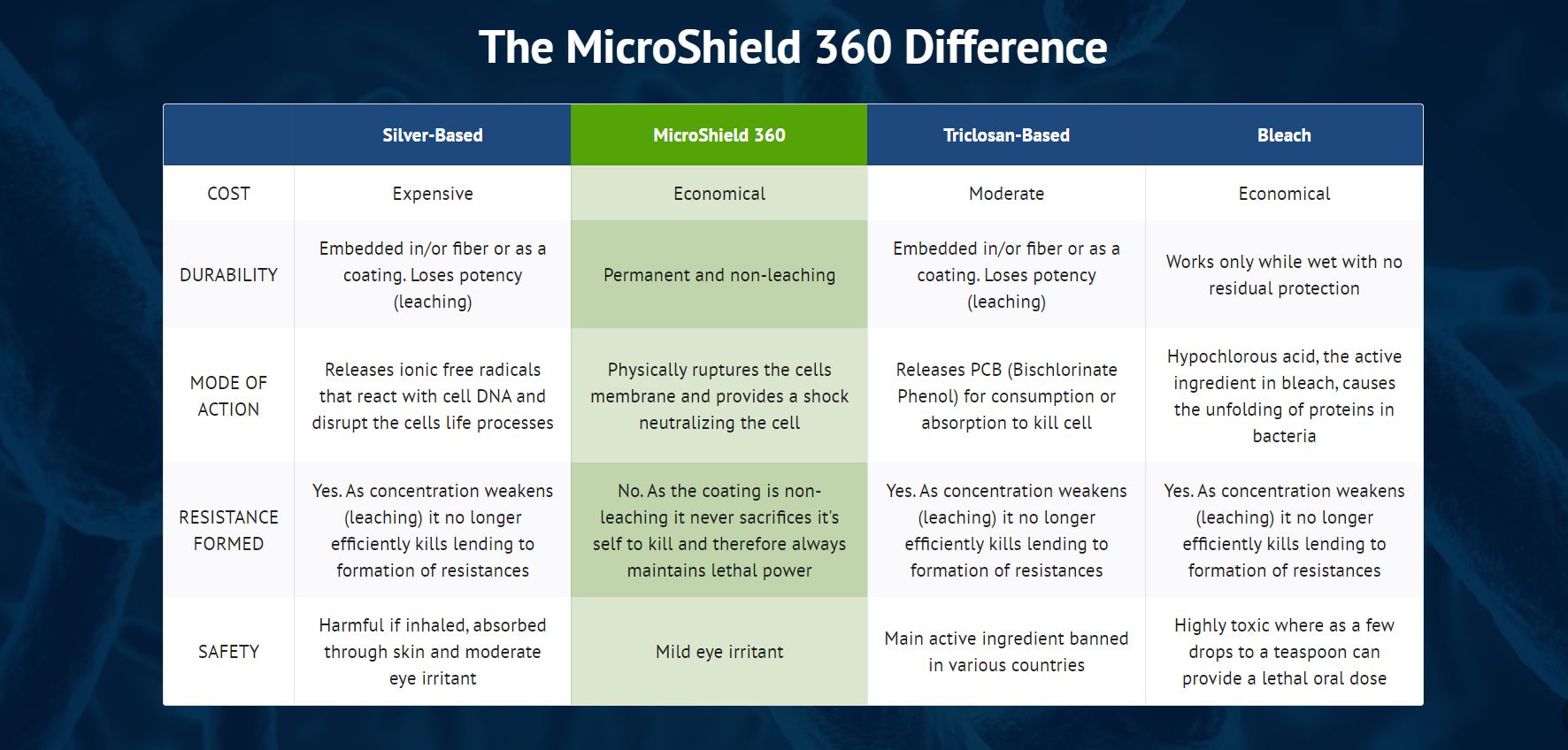 - MicroShield 360 Antimicrobial provides or creates an invisible barrier to inhibit the growth of bacteria which cause staining and discoloration.