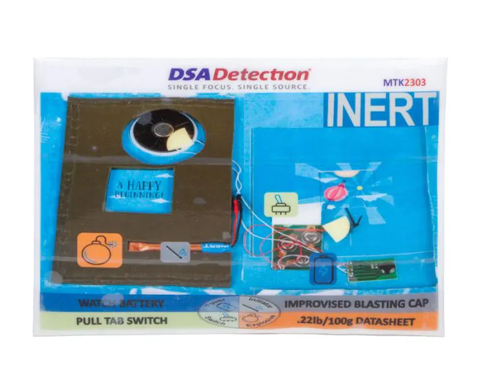 The Detasheet simulant is engineered to have the same density and effective atomic number (Zeff) as the real explosive threat. Due to the complexity and popularity of musical greeting cards, an unmodified (original) card is included with this device. To assist in classroom training, a picture of the internal components is displayed on the outer packaging with each of the P.I.E.S. components identified. This helps build image association without compromising the training aid.